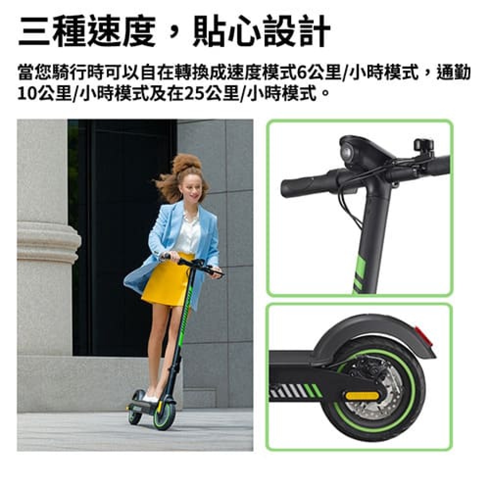 當您騎行時可以自在轉換成速度模式6公里/小時模式,通勤10公里/小時模式及在25公里/小時模式。