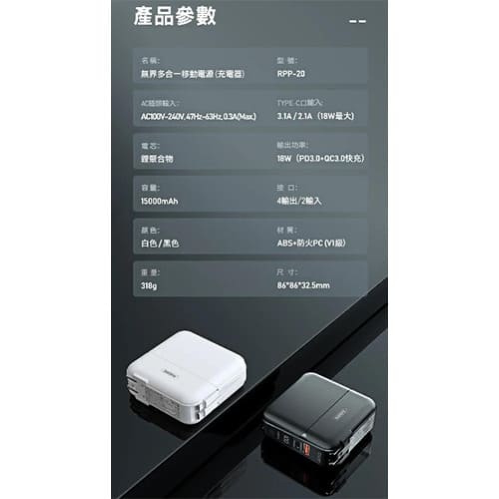 【REMAX】RPP-20 無界多合一行動電源 +充電器 功能多合一 行動電源 15000MAH
