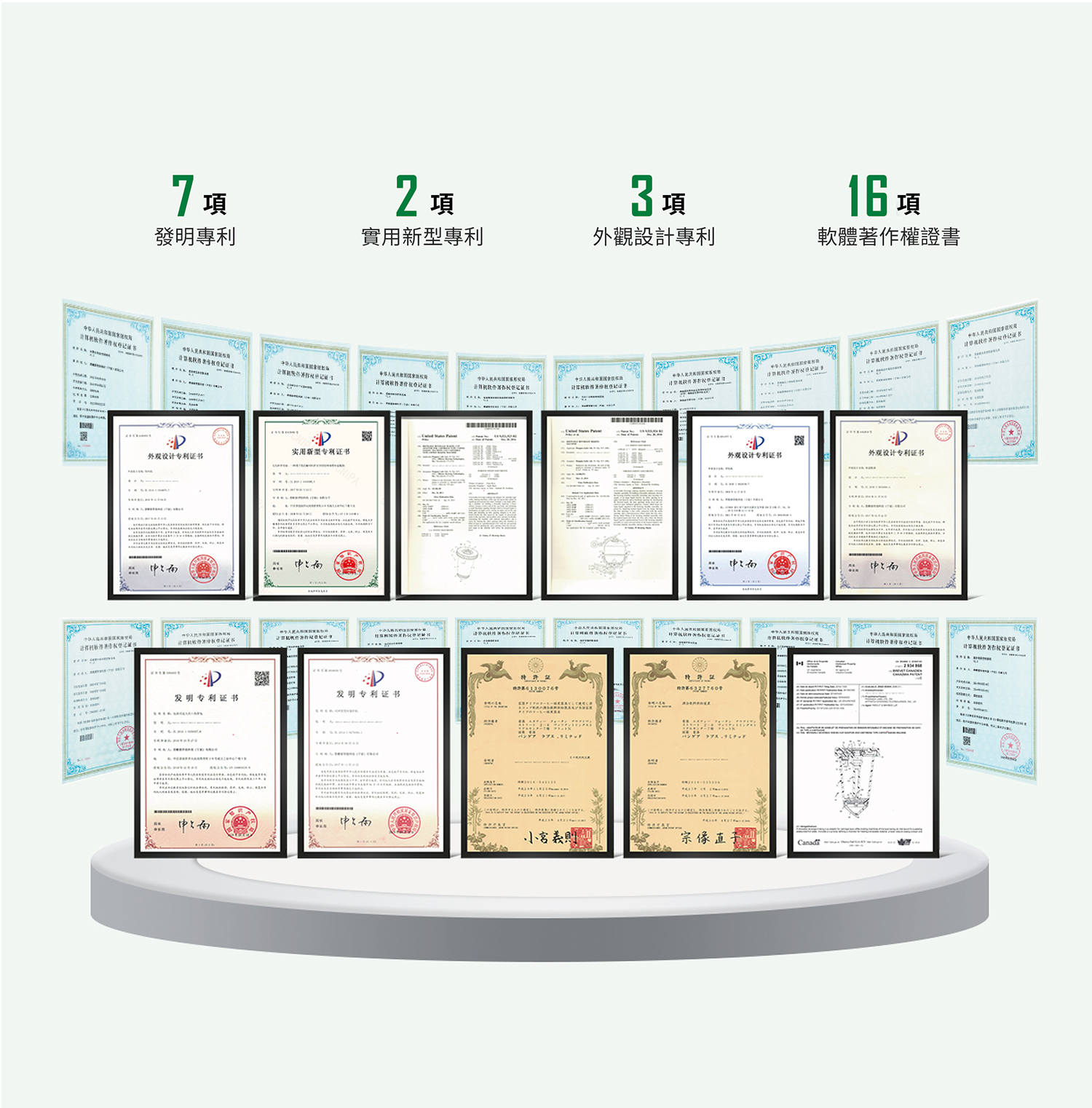 ➤7項研發專利、2項實用型專利、3項外觀設計專利、16項軟體著作權證書